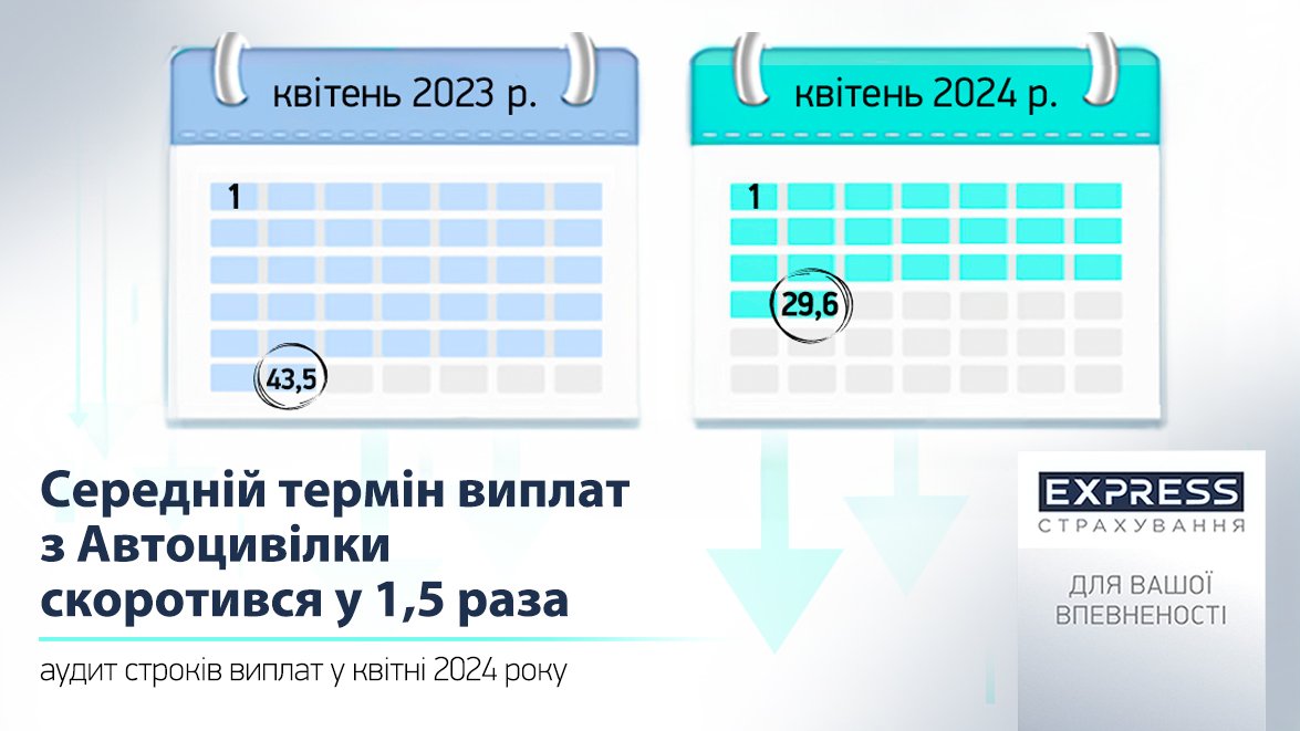 За результатами внутрішнього аудиту страхових виплат з ОСЦПВ у квітні 2024 року, Компанія скоротила середній термін виплат у 1,5 рази порівняно з аналогічним періодом минулого року – до 29,6 днів. При цьому загальна сума виплат страхового відшкодування за цей період зросла у 2,3 рази, і склала 5,9 млн грн.