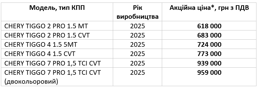 * Акційна ціна - орієнтовна рекомендована роздрібна ціна на визначені автомобілі. Акційні ціни діють на автомобілі 2025 року виробництва, надходження яких в дилерську мережу ТОВ "СІ ЕЙ АВТОМОТІВ" очікується в період з 16.06.2025 р. по 11.07.2025 р. Акційні ціни діють в офіційній дилерській мережі ТОВ "СІ ЕЙ АВТОМОТІВ" на всій території України, за винятком АР Крим і тимчасово окупованих територій, з 12.06.2025 по 31.08.2025 включно на автомобілі CHERY Tiggo 2 PRO Luxury/Лакшері, CHERY Tiggo 4 Comfort /Комфорт та на CHERY Tiggo 7 PRO Premium /Преміум і Premium /Преміум (двокольорове фарбування) 2025р.в. в межах запланованої поставки на обмежену зазначеною поставкою кількість автомобілів.