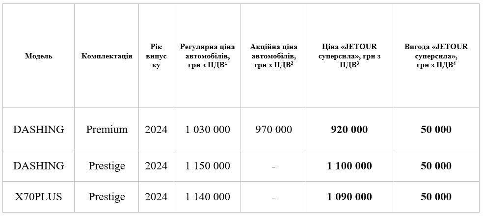 3 Орієнтовна рекомендована роздрібна ціна на визначені автомобілі з урахуванням вигоди у разі придбання з використанням банківського кредиту за програмою "JETOUR суперсила". Програма "JETOUR суперсила" розповсюджується на придбання нових автомобілів JETOUR в кредит за спеціальними кредитними програмами «Партнерська для Укравто 3»/«JETOUR ЕКСПРЕС КРЕДИТ», «Ощад Драйв», «VIP-авто» та «Моя Енергія» від АТ "Ощадбанк"; «Приват Партнерський» від АТ КБ «ПриватБанк». Детальні умови спеціальних кредитних програм АТ "Ощадбанк" та АТ КБ «ПриватБанк», які беруть участь в акційній програмі "JETOUR суперсила" можна отримати у консультантів з продажу автомобілів та кредитних спеціалістів офіційної дилерської мережі ТОВ "АВТО МОТОР ГРУП". Акційні ціни за програмою "JETOUR суперсила" діють в офіційній дилерській мережі ТОВ "АВТО МОТОР ГРУП" на автомобілі JETOUR DASHING 2024 року виробництва в комплектаціях Premium/Преміум і Prestige/Престиж, а також на автомобілі JETOUR X70PLUS 2024 року виробництва в комплектації Prestige/Престиж, з 19.12.2024 по 28.02.2025 включно, або до повного розпродажу наявного складу автомобілів. Кількість автомобілів JETOUR DASHING 2024 року виробництва в комплектаціях Premium/Преміум і Prestige/Престиж, а також автомобілів JETOUR X70PLUS 2024 року виробництва в комплектації Prestige/Престиж обмежена.