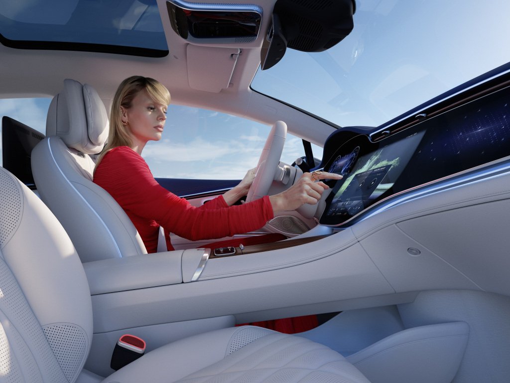 MBUX Hyperscreen – це плавне, без стиків, поєднання декількох дисплеїв, що утворюють разом вражаючу вигнуту смугу екрана шириною 141 сантиметр. Площа екрана, доступна для сприйняття водієм і пасажирами, становить 2432,11 см².