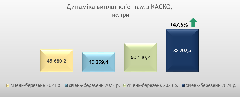 Зокрема, виплати з КАСКО за цей період склали 29,3 млн грн (+44,3%), з ОСЦПВ – 5,7 млн грн (+134,5% до рівня березня 2023 року).