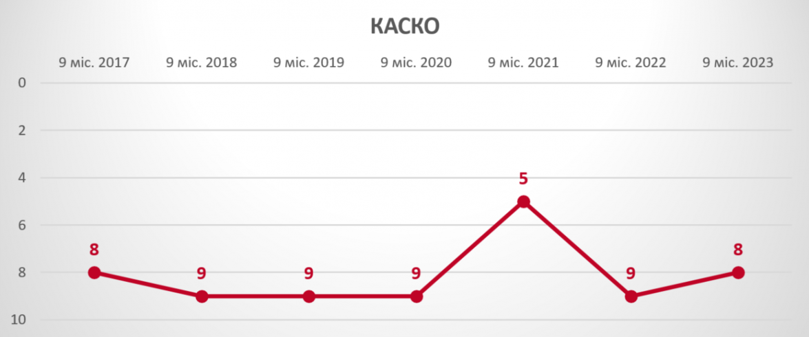За 9 місяців 2023 року обсяг премій Компанії за договорами КАСКО виріс на 64,5% та досяг позначки 444 млн грн.