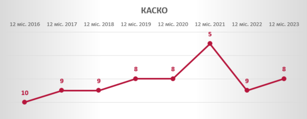 За 12 місяців 2023 року обсяг премій Компанії за договорами КАСКО виріс на 50,8% та досяг позначки 622,4 млн грн. Порівняно з аналогічним періодом минулого року, СК «Експрес Страхування» покращила свою позицію за преміями КАСКО, піднявшись на 8 сходинку рейтингу.