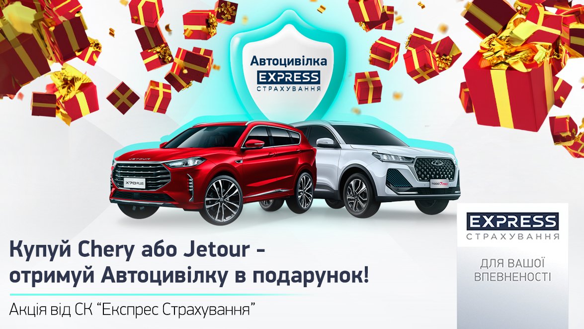 Поспішайте придбати автомобілі брендів Chery чи Jetour в «Автоцентрі на Кільцевій» та отримуйте поліс ОСЦПВ (Автоцивілку) від СК «Експрес Страхування» у подарунок*.