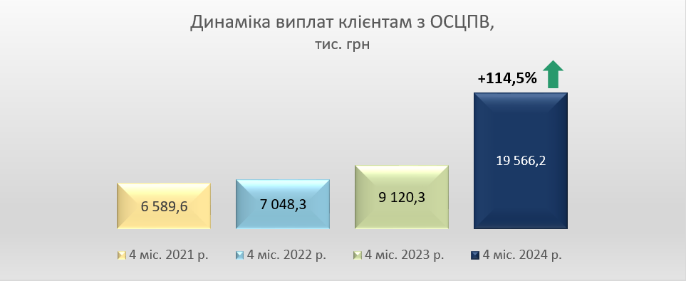 В квітні 2024 року виплати клієнтам склали 43,2 млн грн, що на 93,4% більше, ніж у квітні 2023 року. Зокрема, виплати за договорами КАСКО склали 36,3 млн грн (+92,3%), з ОСЦПВ – 5,9 млн грн (+134,0%).